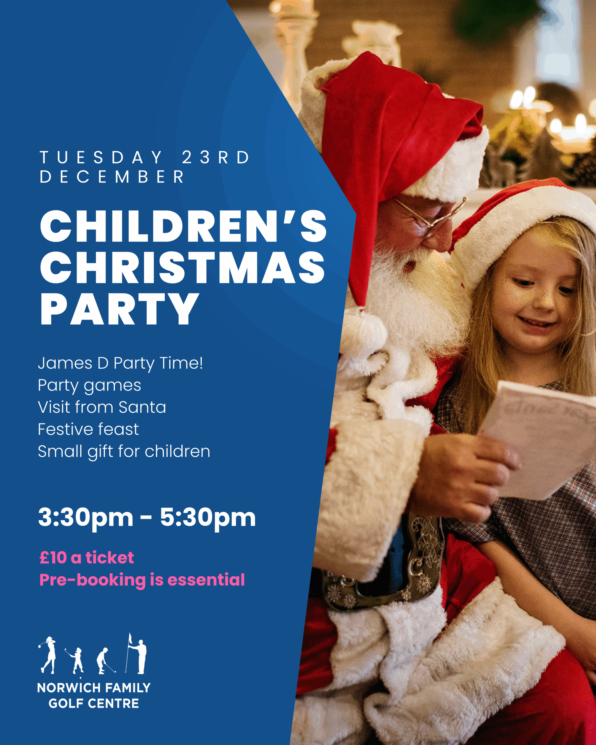Christmas Party at Norwich Family Golf Centre with entertainment from the one and only James D Party Time! £10.00 per child ticket includes party games, festive buffet, squash and a visit from Santa with a small gift!